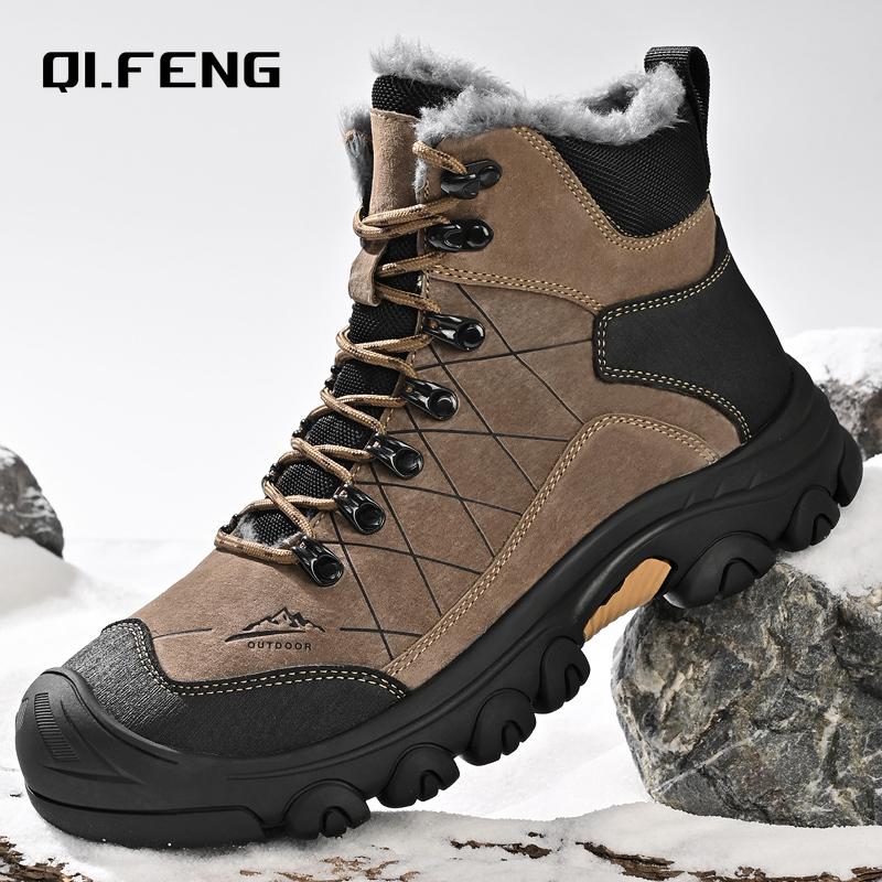 Men's Genuine Leather Outdoor Plush Snow Boots High Top Anti slip Wear Resistant Warm Boots Winter Hiking Large size Sneaker