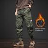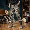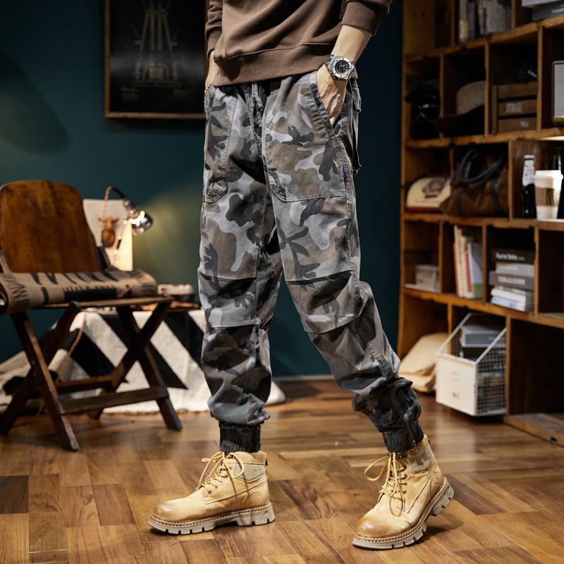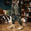 Men's tied feet camouflage overalls wide-leg pants men's micro-pull pants high-end high-crotch trendy pants retro trousers