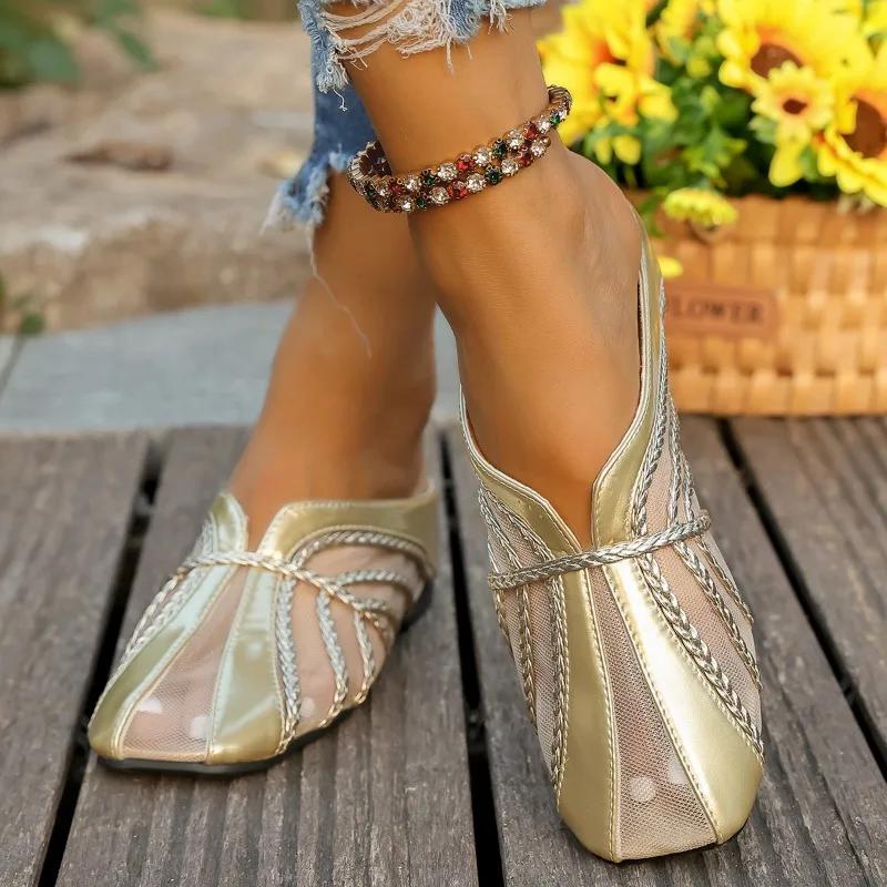 Fashion Wear Hollow Mesh Yarn Outside, Heighten Block Heel Woven Slippers for Women 2025 New Semi-drag Fashion Baotou Cool Slippers