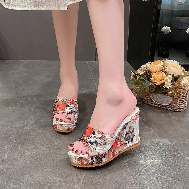 Fashion 2025 Summer Slippers New Embroidered Slippers Fish Mouth High Heels Sandals Thick Fashion Wear Women's Shoes