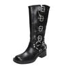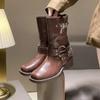 New Winter Denim Boots Women'S Retro Brown Belt Buckle Round Head High Boots Knee Length Boots