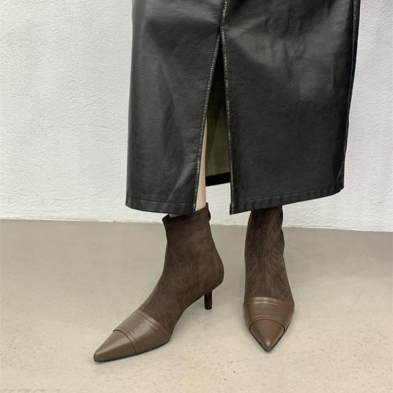 High Heeled Booties Women Autumn Winter New Pointed Toe Spliced Rear Zipper Slim Heel Stretch Skinny Single Boots