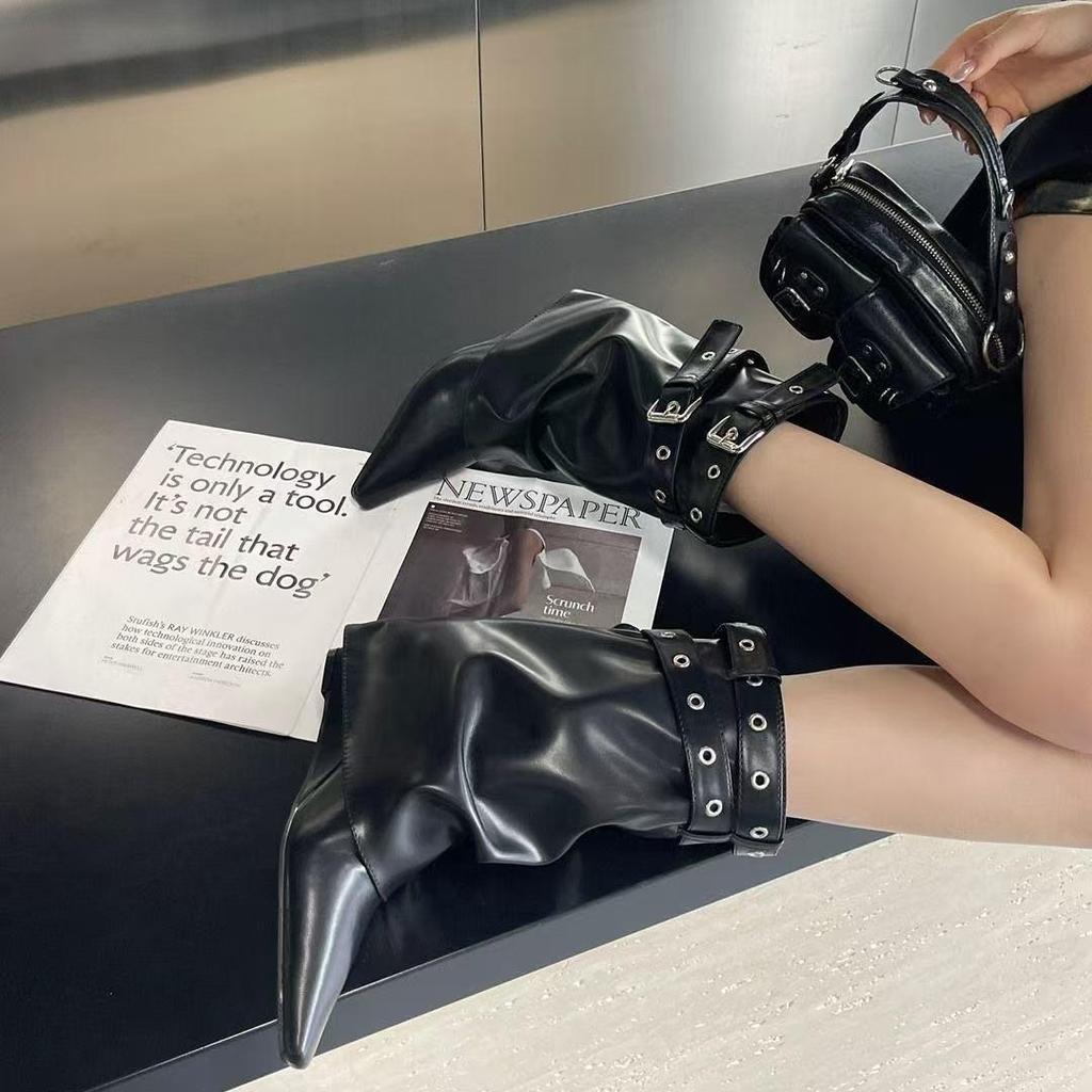 Design Sense White Leather Buckle Pointed Toe Ankle Boots for Women - Autumn 2025, Versatile Slimming Height-Boosting Leg Boots