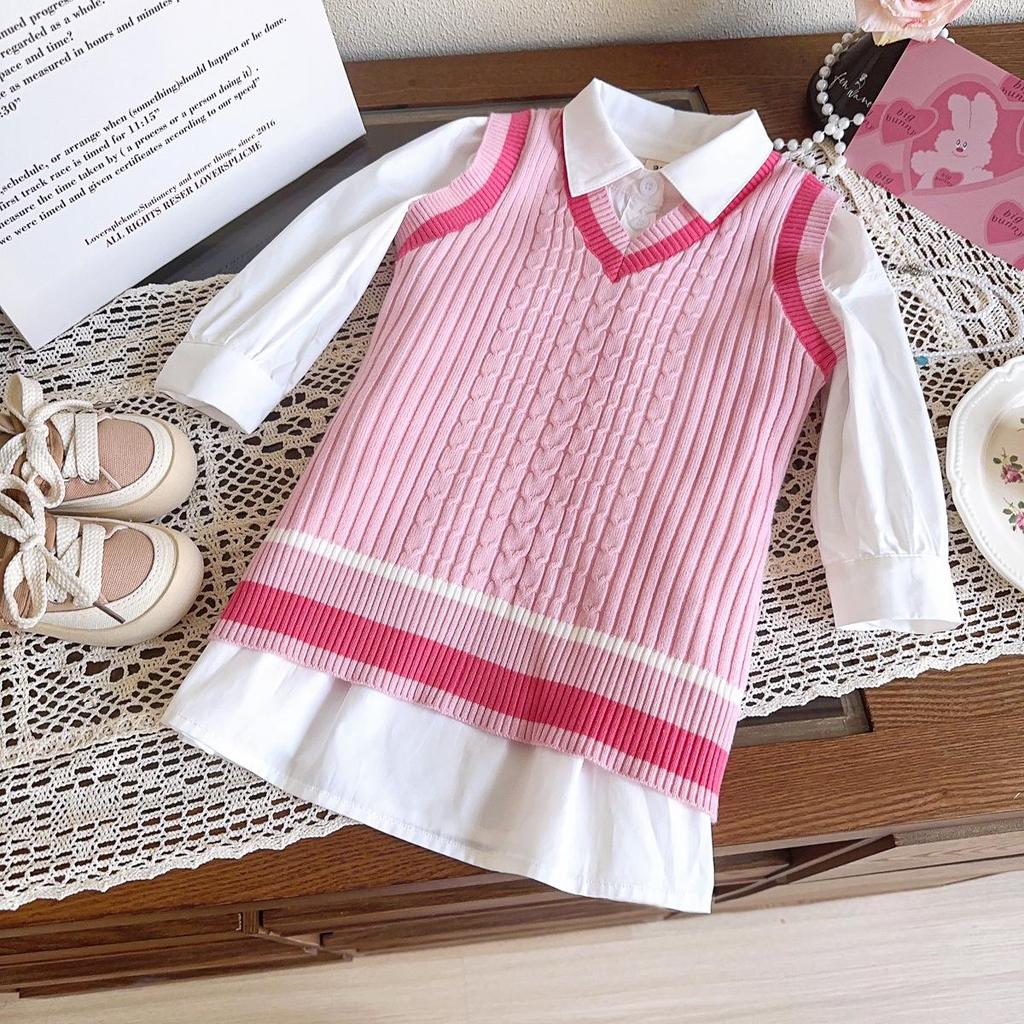 Tyto okouzlující dívčí pletené šaty bez rukávů v kombinaci s košilí s dlouhým rukávem jsou dokonalým doplňkem každého podzimního nebo jarního šatníku.. Je vyrobeno z vysoce kvalitní bavlny a nabízí pohodlí a prodyšnost pro vaše malé dítě.. Stylový design bez námahy kombinuje klasický půvab svetrové vesty s elegancí košile s dlouhým rukávem, díky čemuž je vhodná pro různé příležitosti.. Ať už je to den ve škole nebo rodinná oslava, tento všestranný outfit zajistí, že se vaše dítě bude cítit módně a pohodlně.