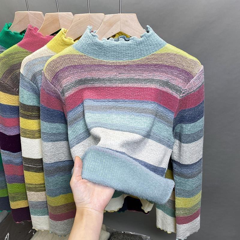 One-piece fleece semi-turtleneck sweater women's fleece thick bottoming shirt autumn and winter new striped knitted sweater with top inside