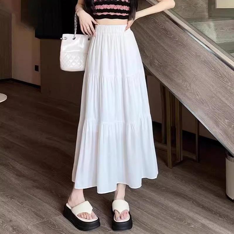 Women's High-Waist Drape Pleated A-Line Skirt - White Korean Style Midi with Hip-Covering Swing