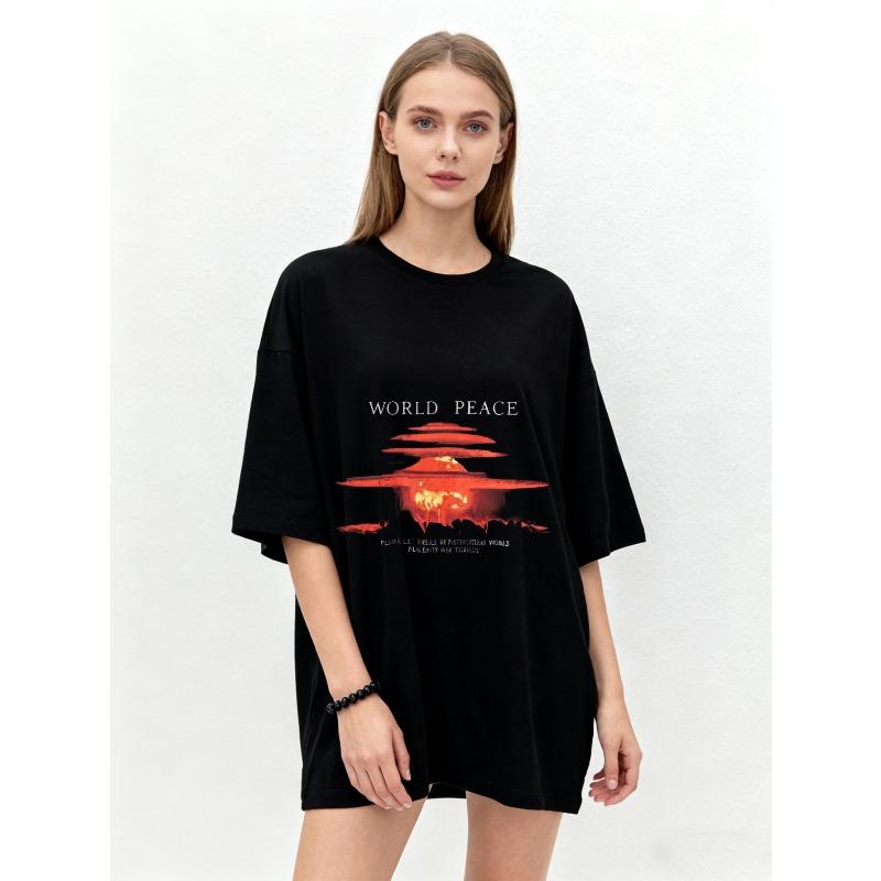 Oversized T Shirt Black World Peace Nuclear Explosion Print Graphic Tee Casual Streetwear Unisex Fashion Top Summer Outfit