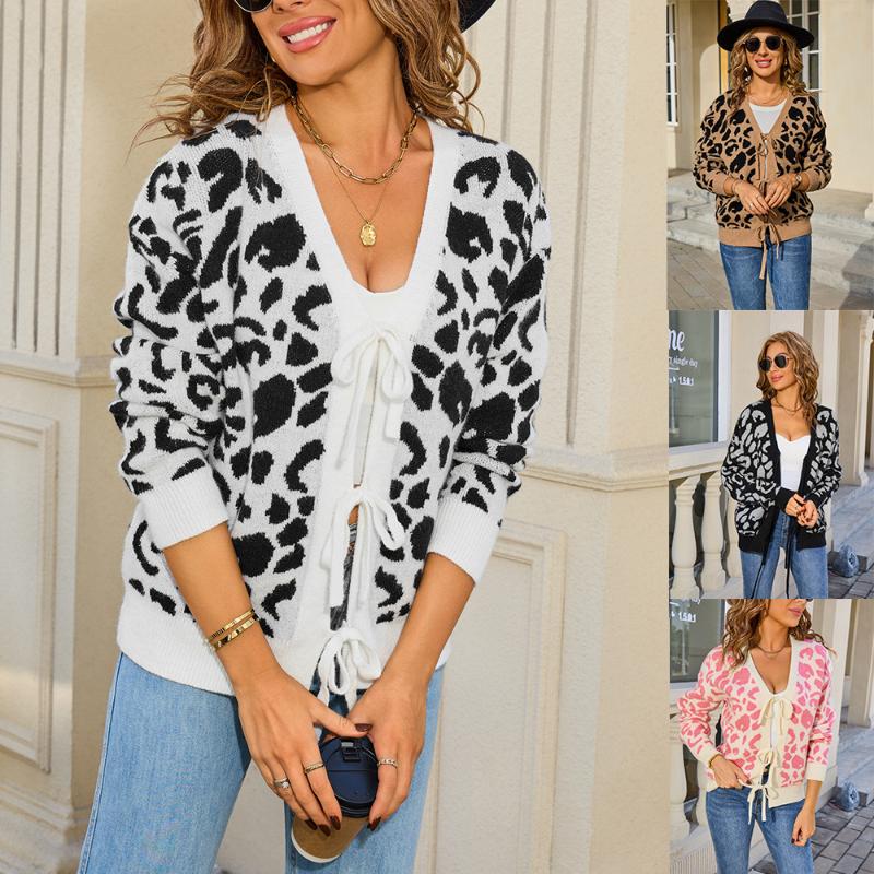 Nové podzimní oblečení Svet s leopardím vzorem Dámský kardigan Volný líný styl Pletený top s provázkem Bunda