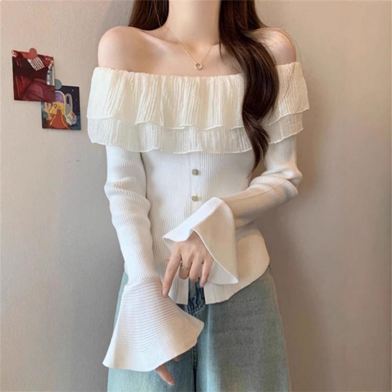 Lotus leaf edge one-word shoulder horn sleeve black shirt women's early autumn temperament thin design short top