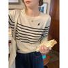 Chic temperament Early autumn crew neck retro high-end striped embroidered inner long-sleeved knitted bottoming shirt women's top