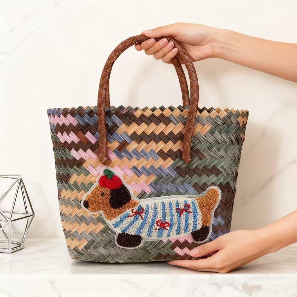Vysoce kvalitní ručně vyráběná tkaná kabelka a úložný koš s výšivkou jezevčíka