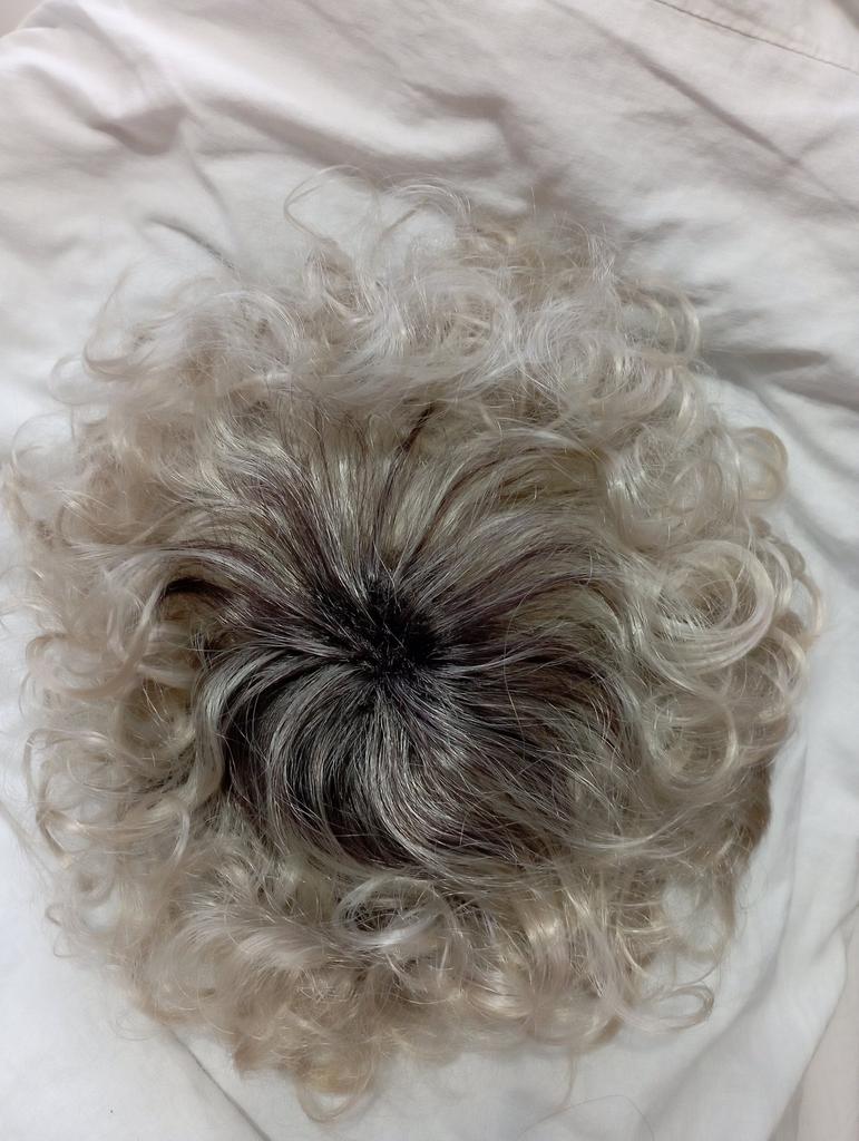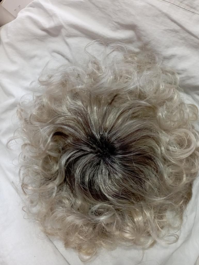 Uprostřed paruky je pleš z krátkých černých vlasů. Není zakrytá žádnými loknami. Je to jako talířek na lebce. Paruka je vadná, neodpovídá popisu, takovou nosit nelze!