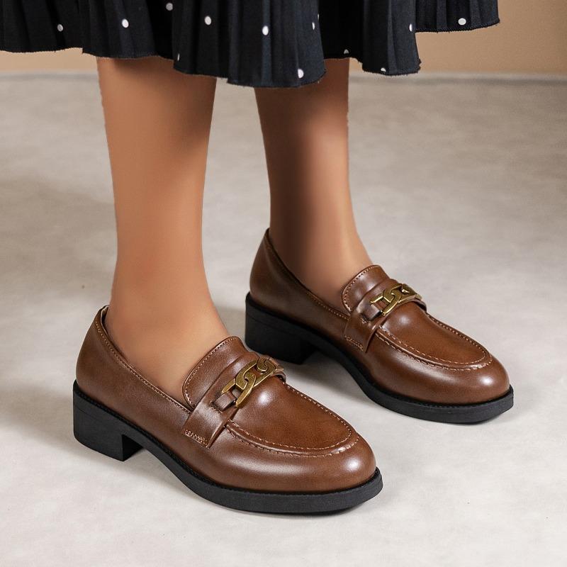 Vintage chain low-top shoes 2025 autumn new plus-size British style mid-heel small leather shoe women