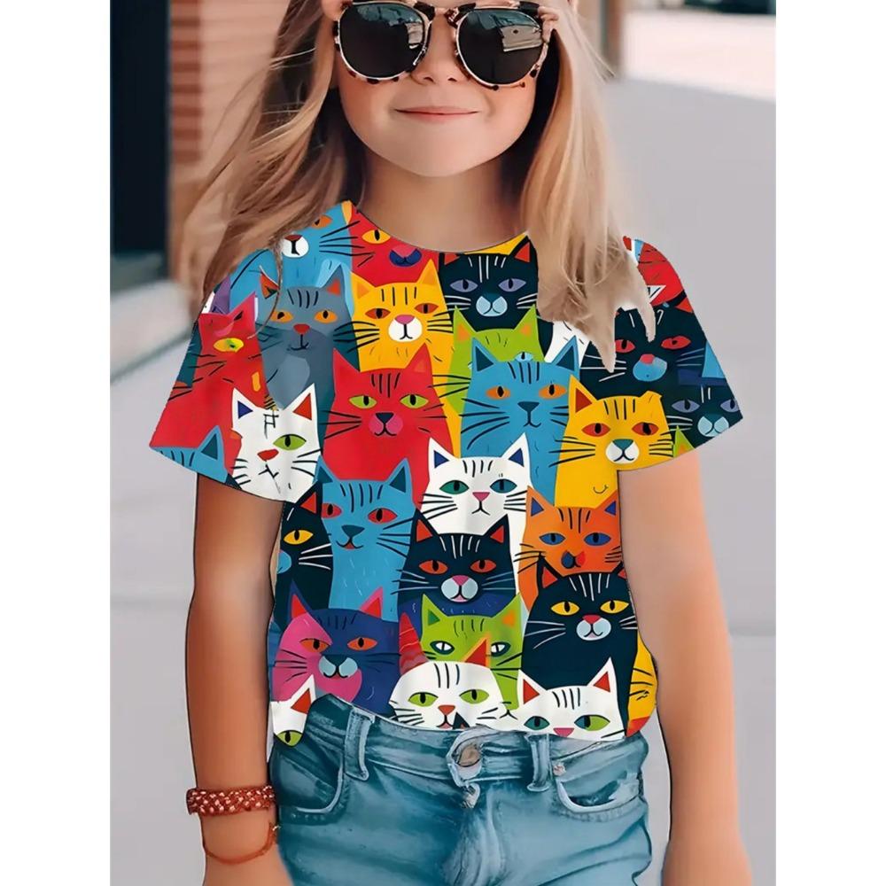 Colorful Cat Girl's T-Shirt Cute Patterns Summer Short Sleeves 3D Print Girl's Top Fashion Casual Streetwear Children's Clothing