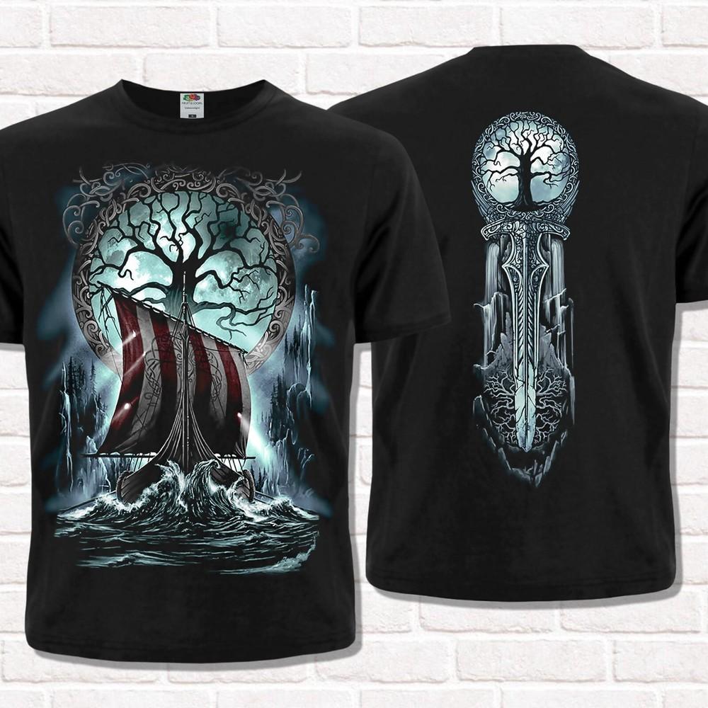 Černé tričko Yggdrasil. Drakkar. Vegvisir, Runový kompas. Vikingský styl. Asatru.
