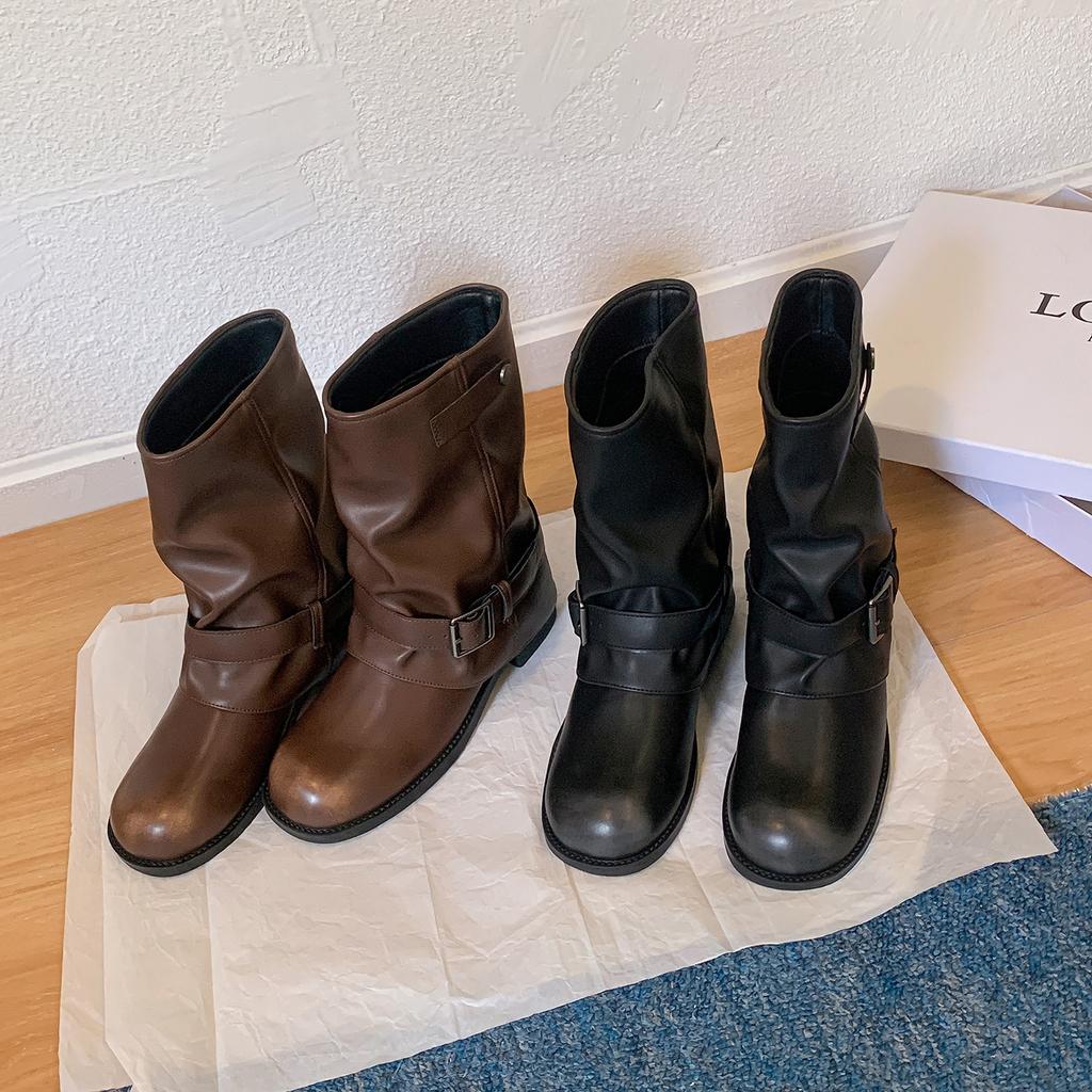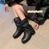 Genuine leather~ retro trouser tube short boots women's thick heel 2025 new pleated stacked Martin boots western cowboy knight boots