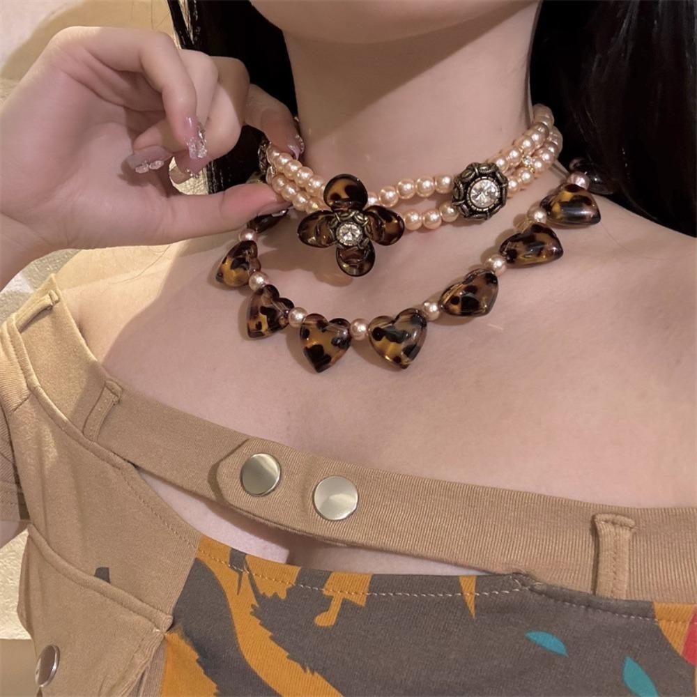 Vintage Flower Heart Necklace Leopard Clavicle Chain Fashion Pearl Beaded Choker Girls
