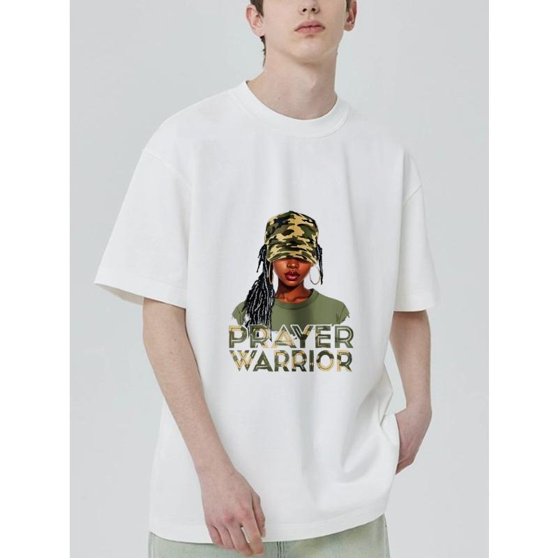 Černé tričko s grafikou Modlitebního bojovníka a designem maskáčové čepice pro běžné nošení