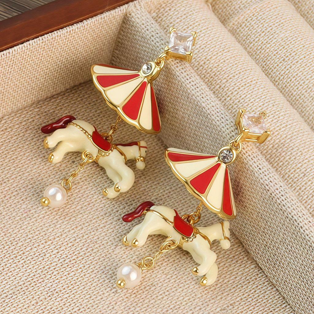Creative Enamel Carousel Pearl Pendant Earrings & Necklace - European & American Style Christmas Series