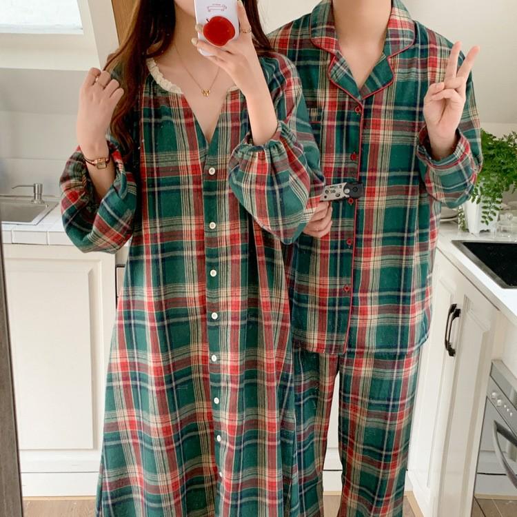 This comfortable and stylish set is perfect for autumn lounging. Made from a soft cotton blend, it features a charming green plaid pattern that embodies the cozy spirit of the season. The set includes a long sleeve dress and matching pajama bottoms, offering a loose-fitting design for ultimate comfort. Crafted with attention to detail, it's an ideal choice for relaxed home wear as the weather cools.