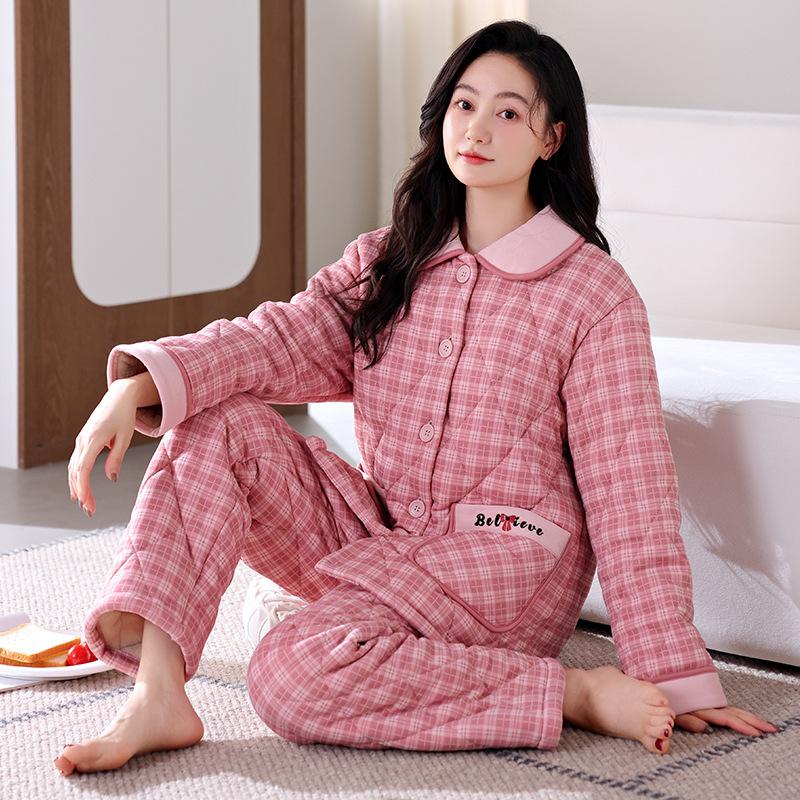 Pure Cotton Padded Pajamas Women'S Winter Three-Layer Thickened Velvet Autumn And Winter Warm Loungewear Set