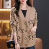 Women's V Neck Printed Knitted Cardigan Autumn Winter Loose Thick Plus Size Sweater Jacket