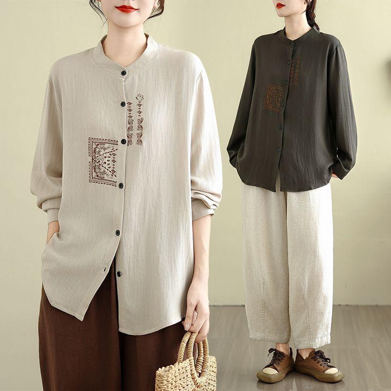 Bavlněná a lněná retro čínská vyšívaná košile s dlouhým rukávem jaro podzim nová volná ležérní všestranná top