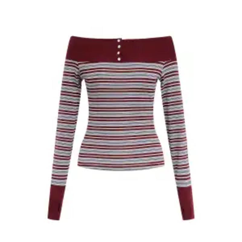 Retro Striped Stitching One-shoulder Off-shoulder Slim Long-sleeved Top for Women Autumn Design Bottoming T-shirt