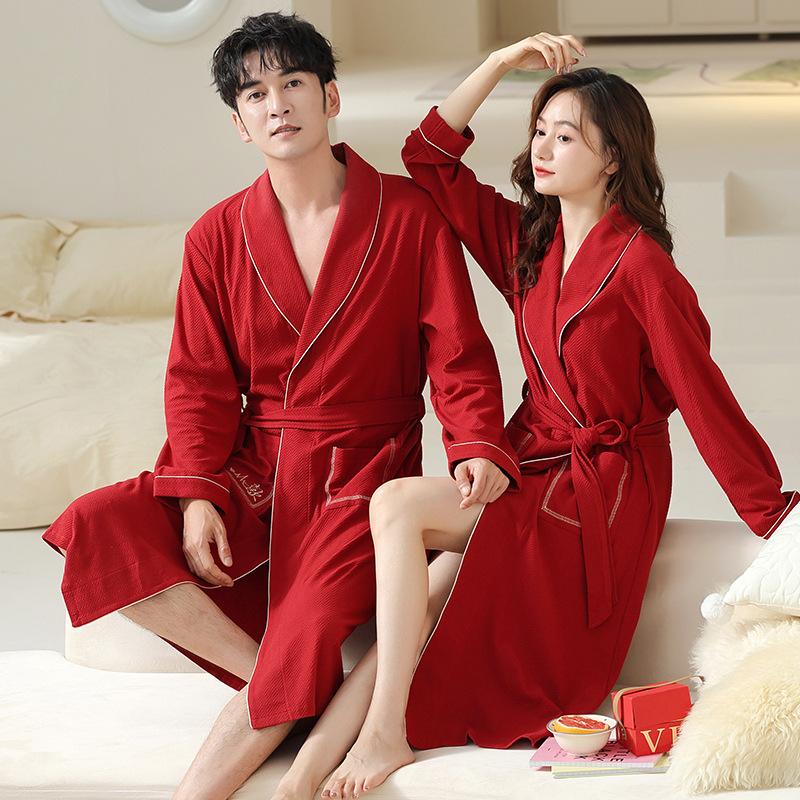 Couple Pajamas Women'S Spring And Autumn Cotton Long-Sleeved Nightgown Bridal Dressing Gown Bathrobe Men'S Big Red Wedding Suit