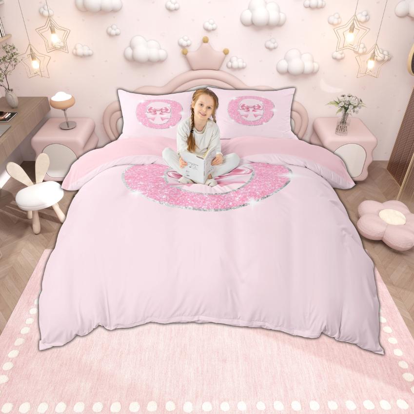 Homewish Personalized Initial Letter O to Z Duvet Cover Set, Dreamy Pink Bow Knot Bedding for Girls, Glitter Print Decor