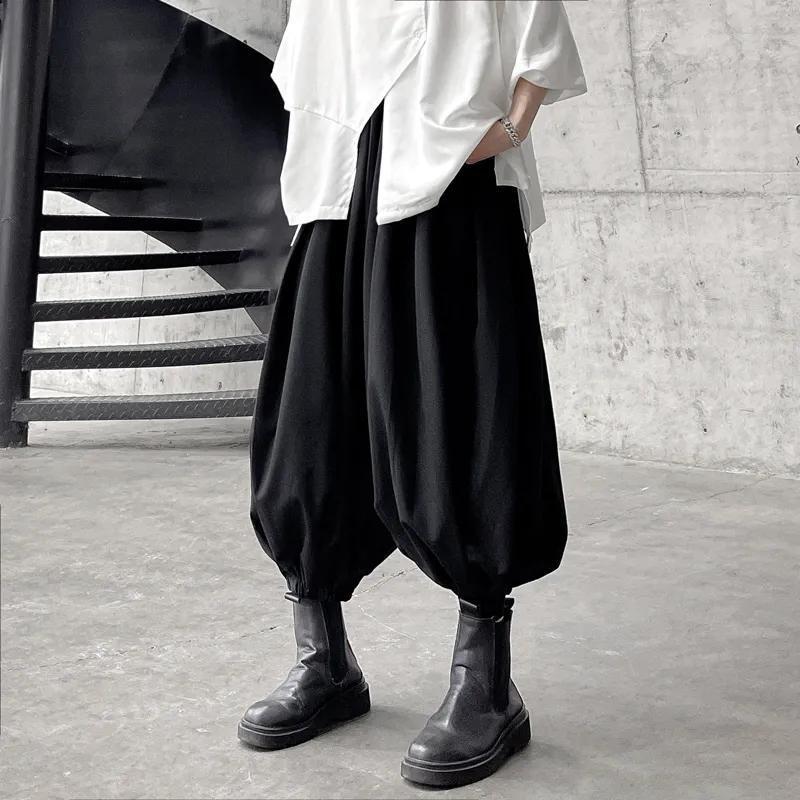 Pánské podzimní ležérní kalhoty volného střihu se širokými nohavicemi se stylovým ohrnutým lemem a zkráceným lampionovým designem