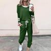Women's Fashion Loose Color-Block Striped Long-Sleeve Round-Neck Drawstring Sports Casual Top And Pants Two-Piece Set