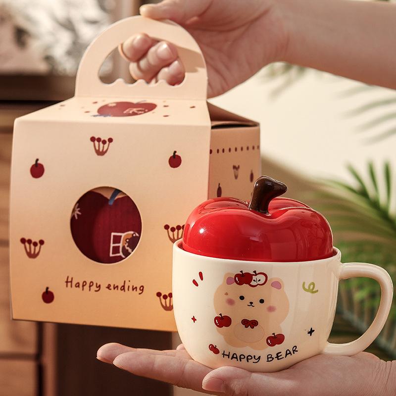 High-value apple mug, cute bear ceramic water cup with lid, birthday gift for girls, girlfriend's souvenir