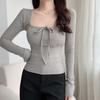 Thin Sweet Slim Tops Square Neck Lace Up T-shirt All-Match Long Sleeve T-shirt Girls