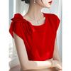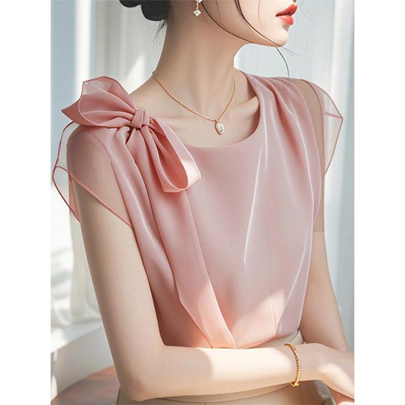 Nové francouzské vysoce kvalitní šifonové tričko pro ženy s niche krásou, krátký rukáv, volné, růžový top na léto