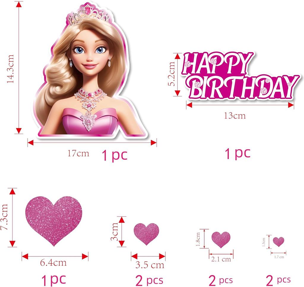 9Pcs Girl Cake Topper Set, Princess Cake Decoration Glitter Happy Birthday Cake Toppers Heart Party Supplies Favor Decorations