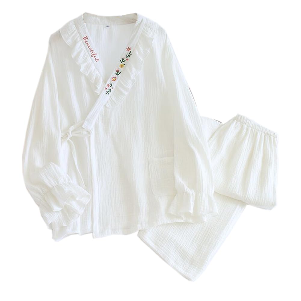 IDOHEMO Long Sleeve Jinbei Top and Bottom Set for Size XL Women's Pajamas, Gauze, 100% Cotton, Loungewear, Girls, Spring/Autumn, White,
