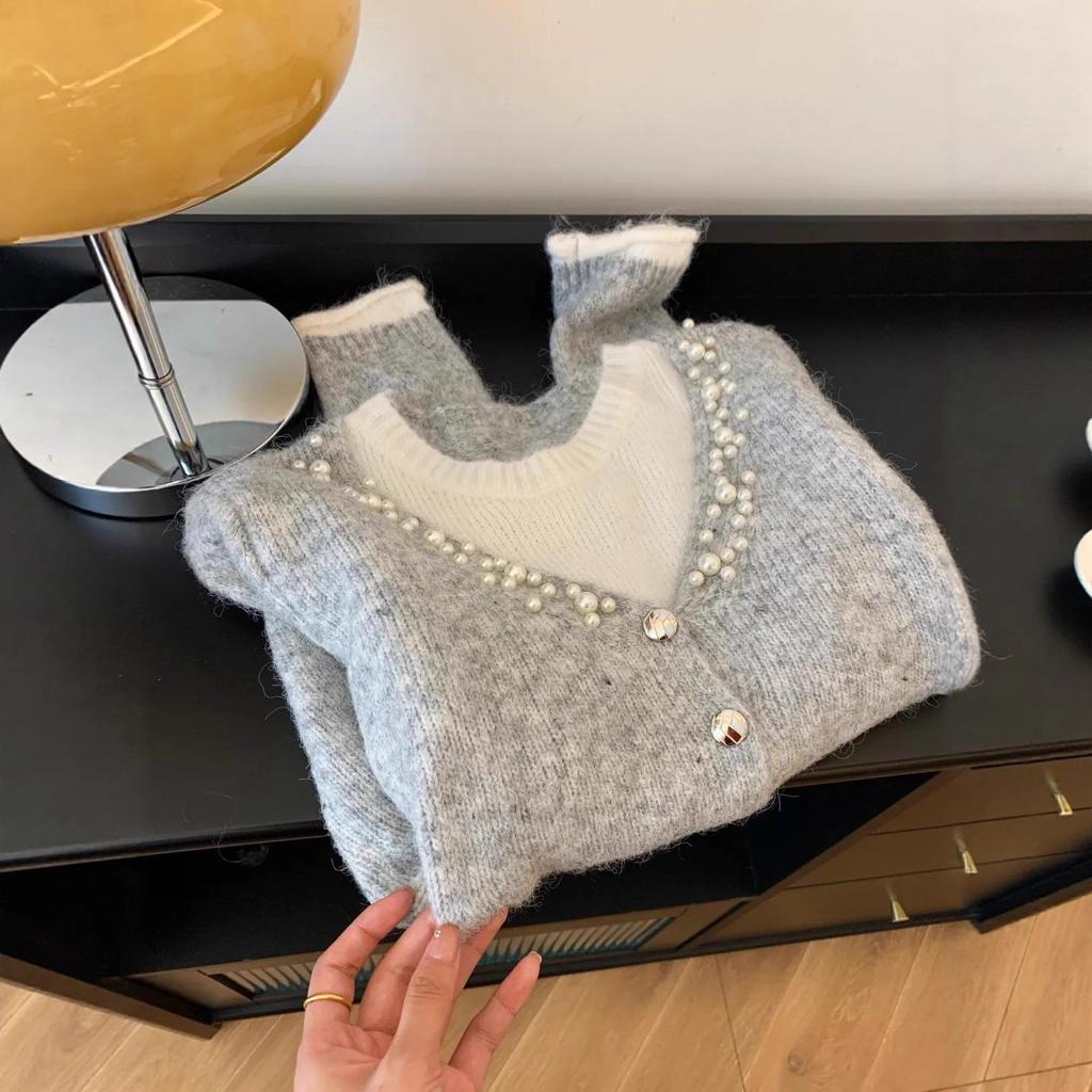 Grey stacked fake two-piece top women's lazy style temperament knitted sweater