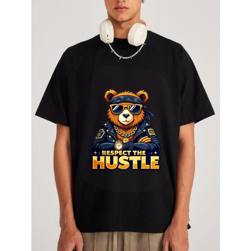 Crewneck T Shirt White Bear with Sunglasses and Bandana Respect The Hustle Graphic Print Streetwear Casual Wear
