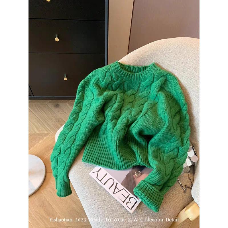 Thickened! Green twist crew neck sweater women's autumn and winter new lazy outside loose knitted top