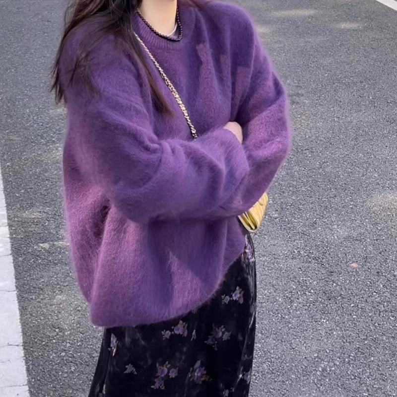 Purple crew neck plush mink plush pullover women's autumn and winter new high-end loose lazy knitted sweater top
