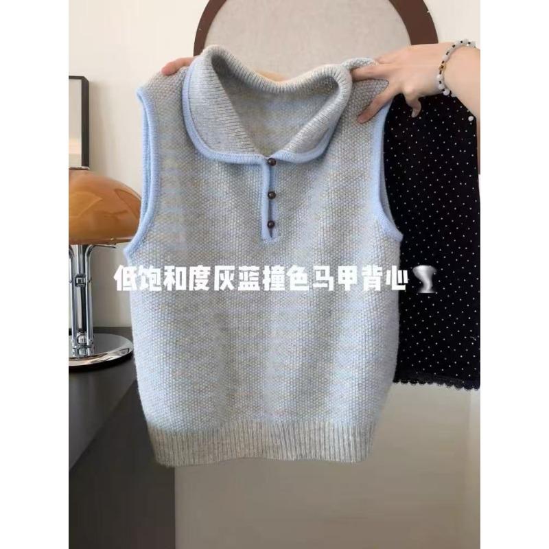 Wool striped polo collar vest knitted sleeveless vest women's autumn new overlay top