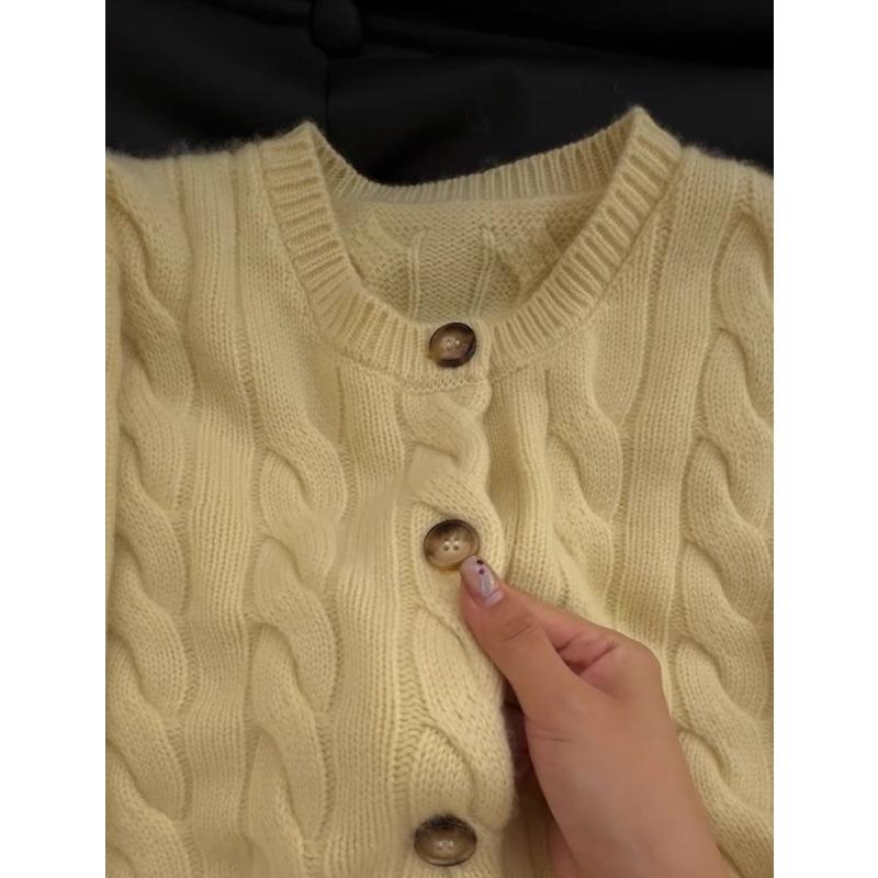New twist crew neck sweater jacket women's autumn and winter soft waxy lazy gentle wind yellow knitted cardigan