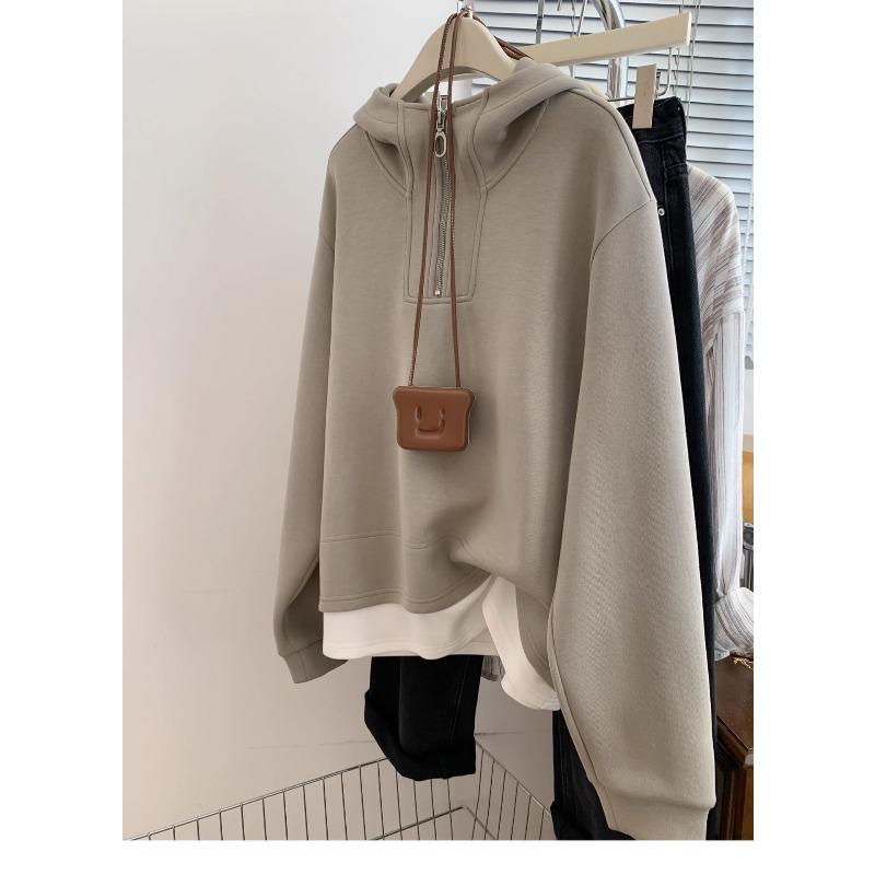 Fake two pieces fleece thickened semi-zipper hooded sweater women's autumn, winter and winter shoulder small pullover loose
