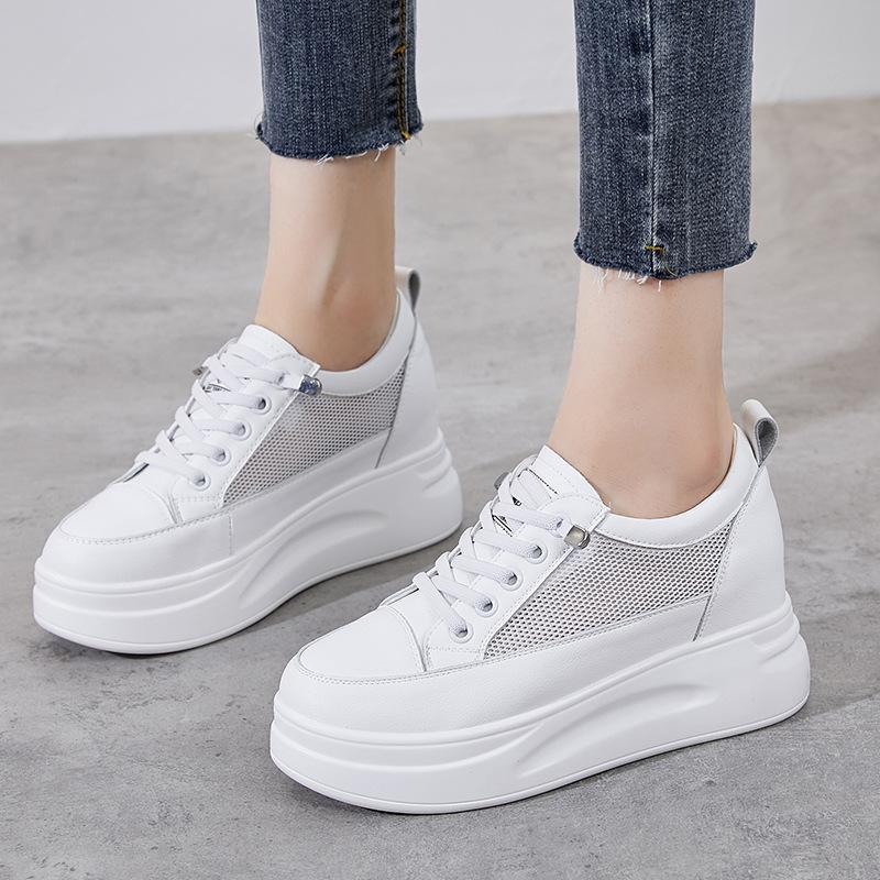 Fashion Summer New Style Thick-soled Insole Height-increasing Genuine Leather Women's Shoe Mesh White Sneakers Casual Sports Women Shoes