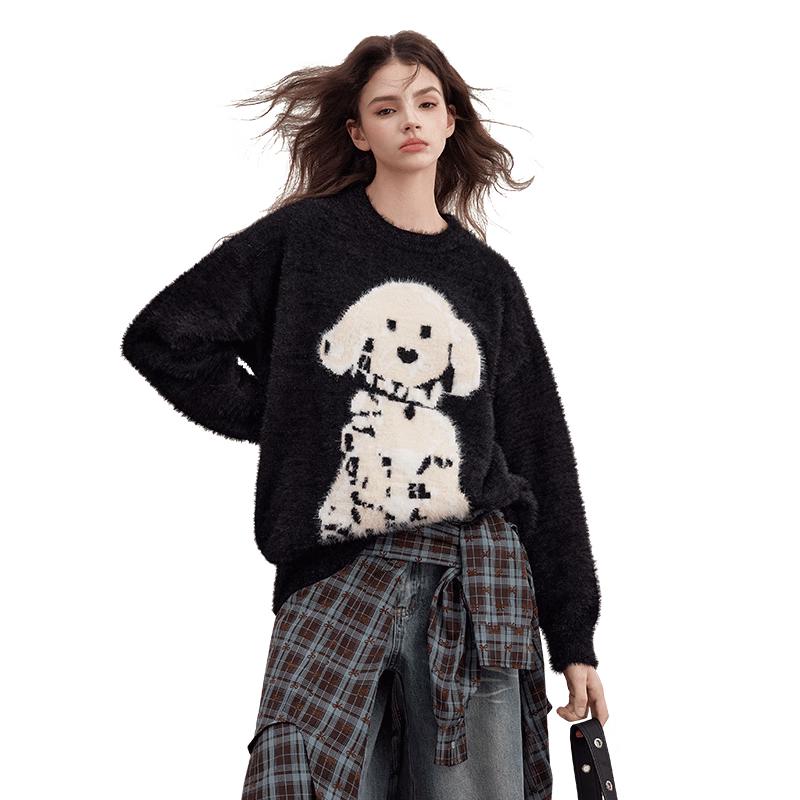 UNIFREE Contrast Dog Pattern Loose Pullover Sweater