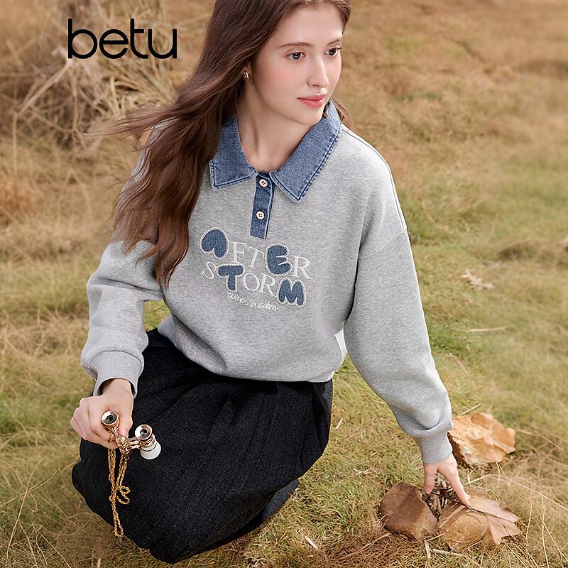BETU Women's 2025 Autumn Embroidered Denim Patchwork Sweatshirt