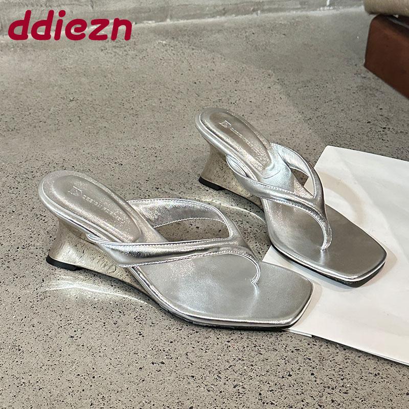 Fashion Silver Fashion Wedges Slippers Shoes For Women Flip Flops Female Slides Square Toe Ladies Wedges Heeled Slippers Shoes Sandals