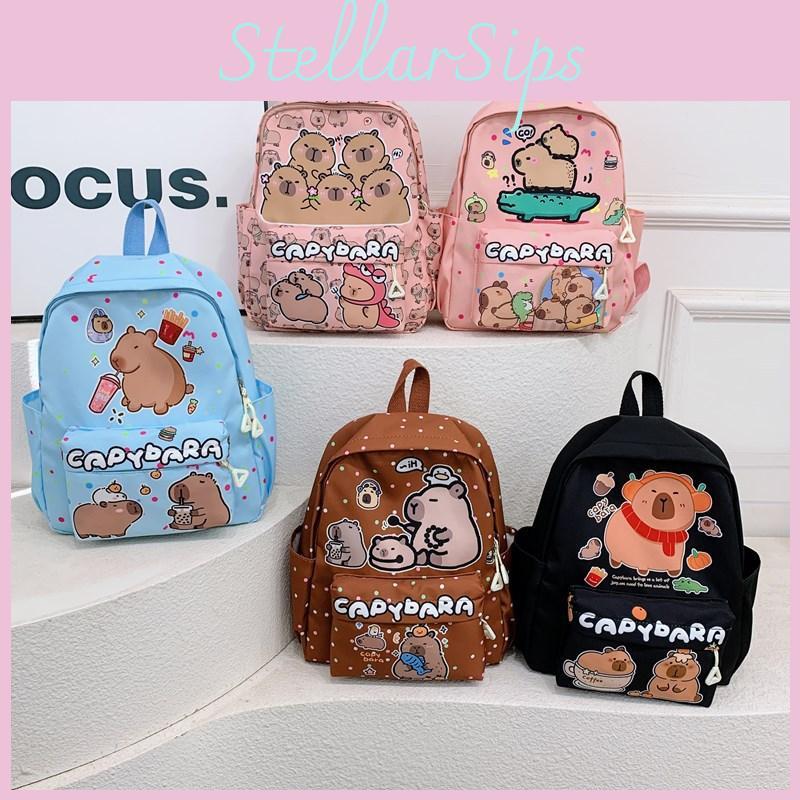 Cute Capybara Drinking Milk Tea Bcrocodile Fries Cartoon Pattern Kid Backpack For Educational Activities
