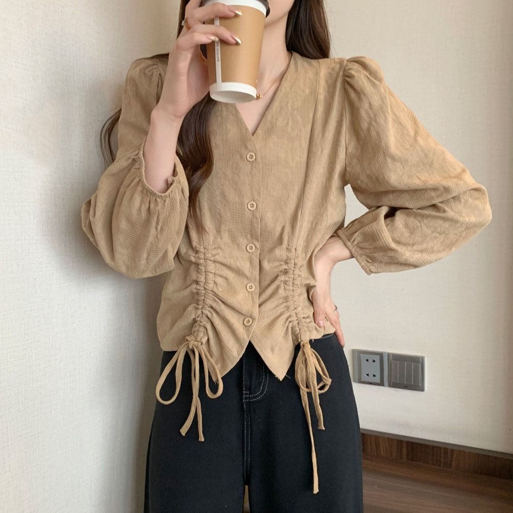 Loose Long Sleeve Shirts V-neck Ladies Shirt Top Sweet Lace-up Drawstring Blouse Girls